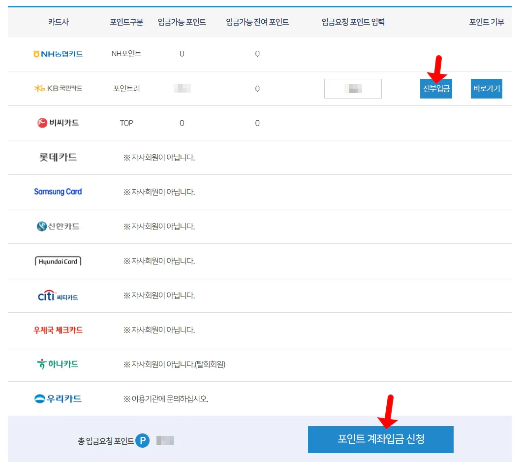 9. 포인트 우측에 전부입금 버튼을 누르시고 하단에 포인트 계좌입금 신청 버튼을 눌러주세요.