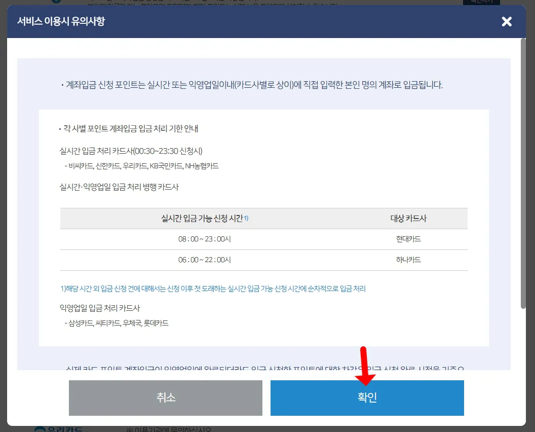 10. 카드사마다 포인트를 계좌입금 해주는 시간이 달라요. 삼성카드, 씨티카드, 우체국, 롯데카드는 익영업일에 입금 처리가 됩니다.