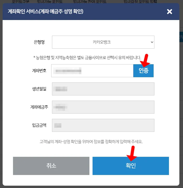 11. 카드 포인트를 입금 받을 은행명과 계좌번호를 입력하시고 인증 버튼을 눌러주세요.