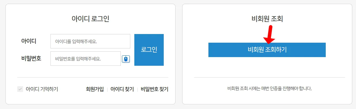 3. 로그인 화면과 비회원 조회가 나오는데, 회원가입 하실 필요없이 비회원 조회하기 버튼을 눌러주세요.