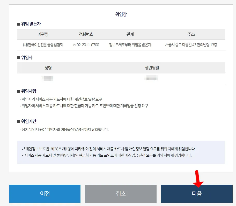 6. 오른쪽 상단에 위임 동의를 클릭하시고 다음을 눌러주세요.